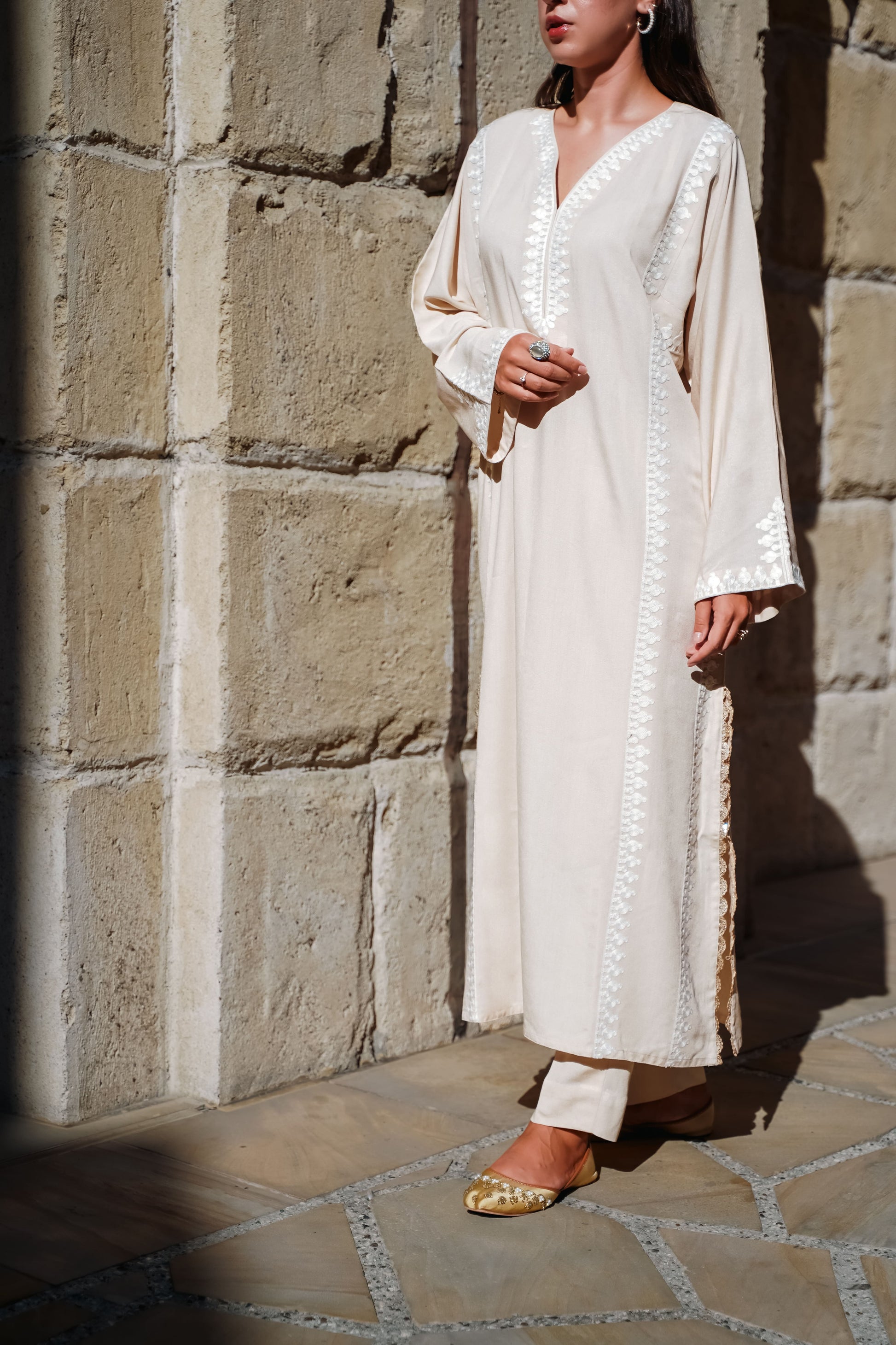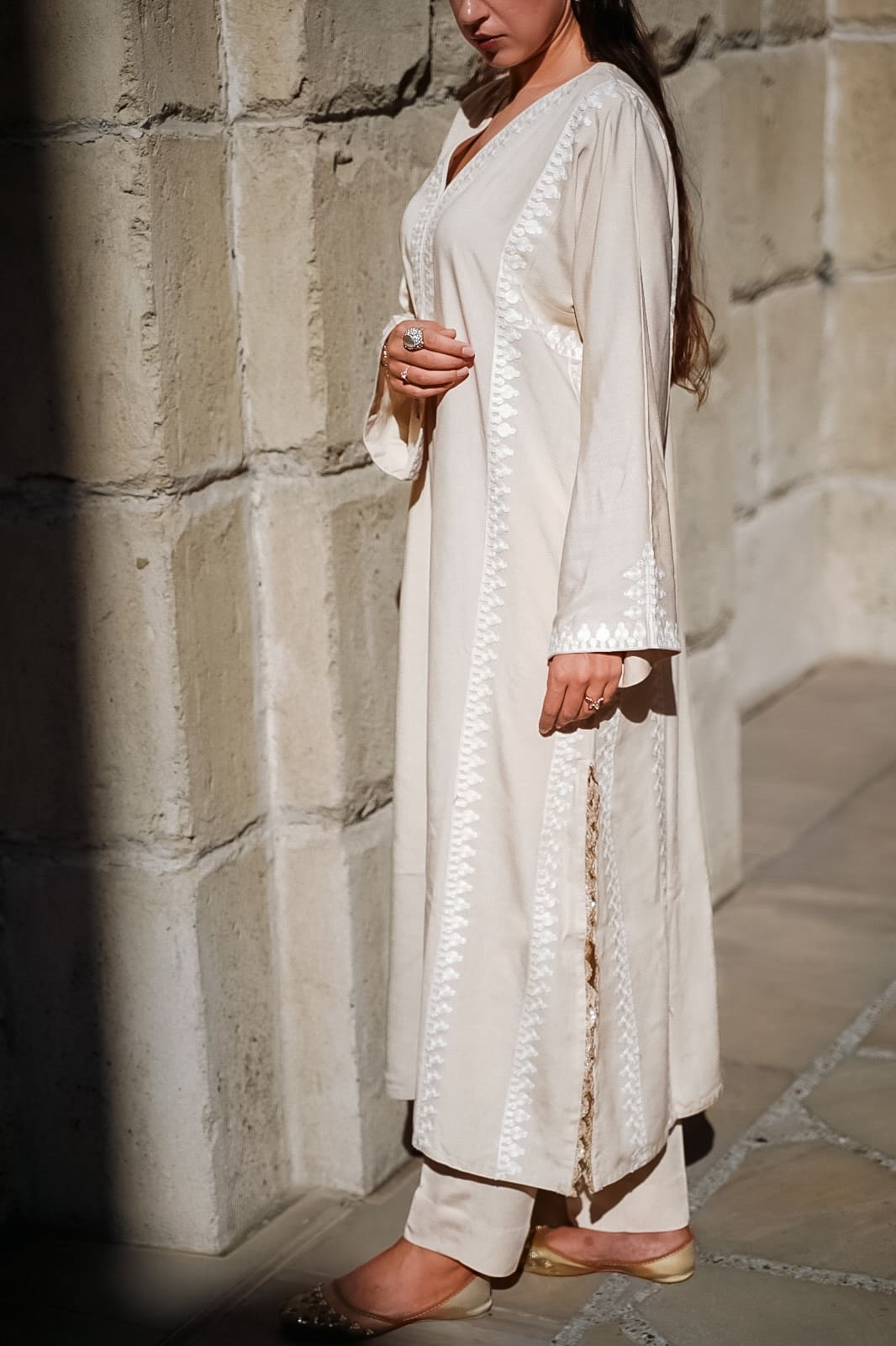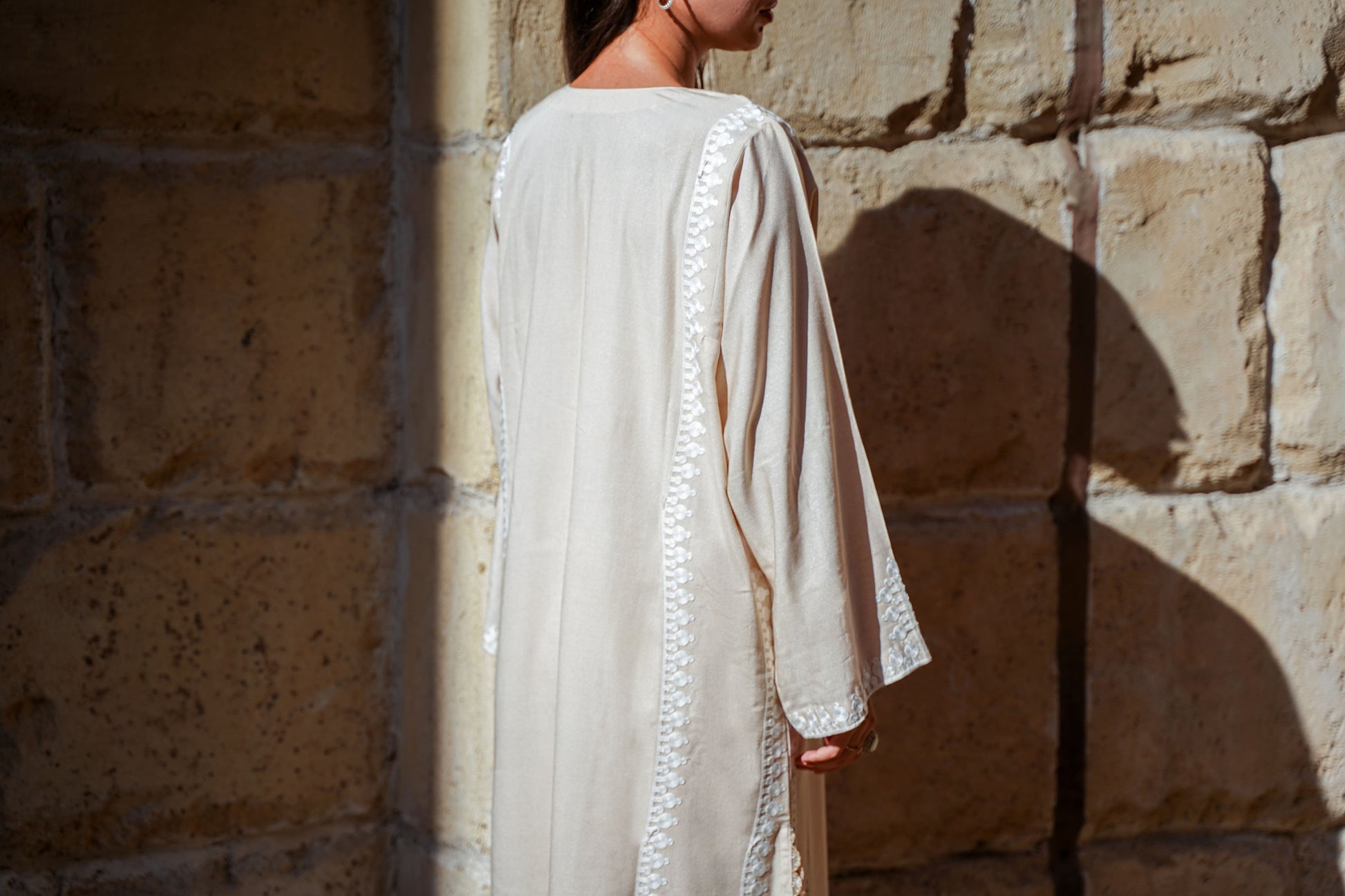 Elegant free size dress features a soft, flowing material in a muted beige color, perfect for a sophisticated look. The dress is adorned with delicate white aari embroidery running along the neckline, cuffs, and extending down the sides, adding a touch of intricate detail. The long sleeves and modest V-neckline enhance its graceful silhouette, while its relaxed fit ensures comfort.