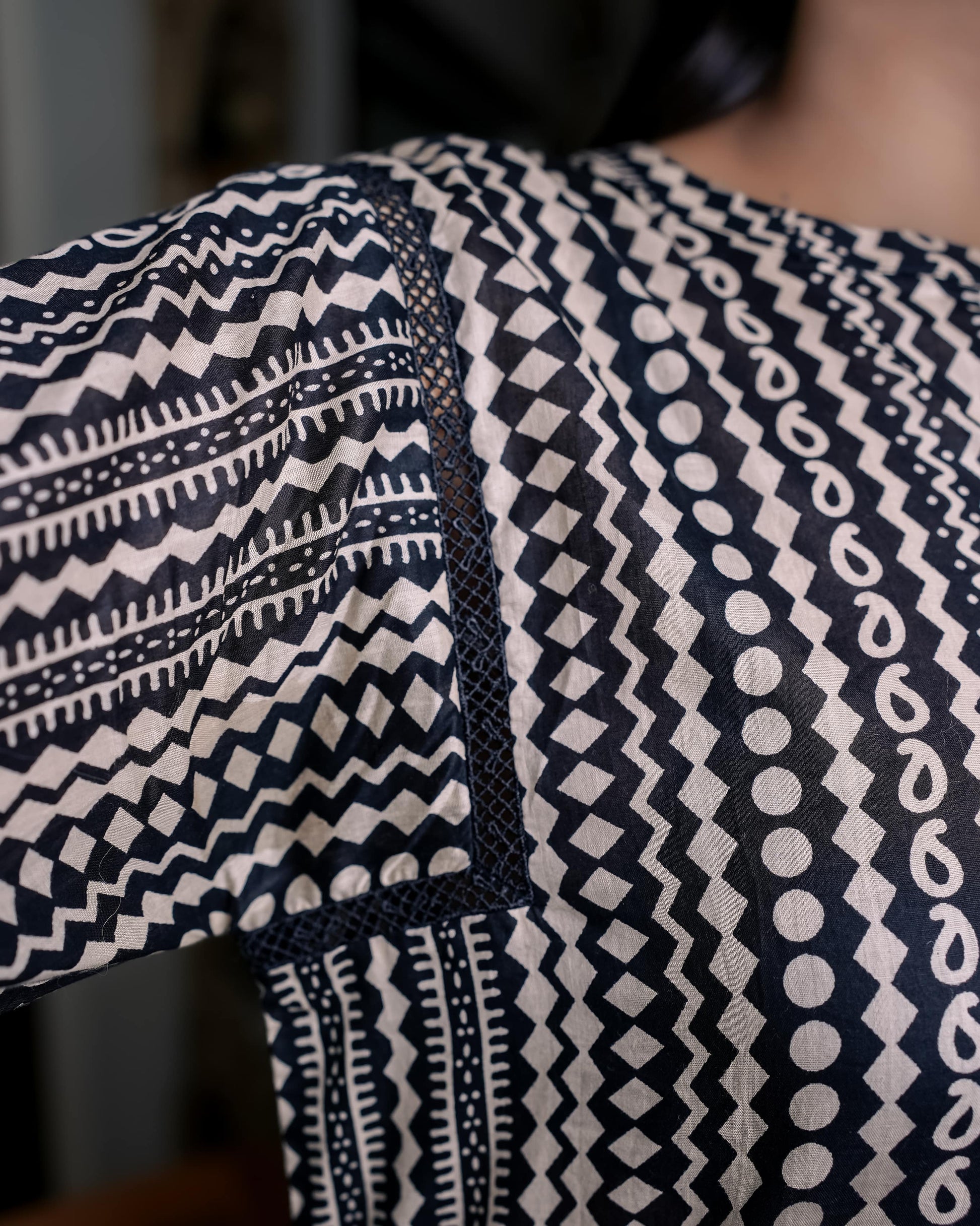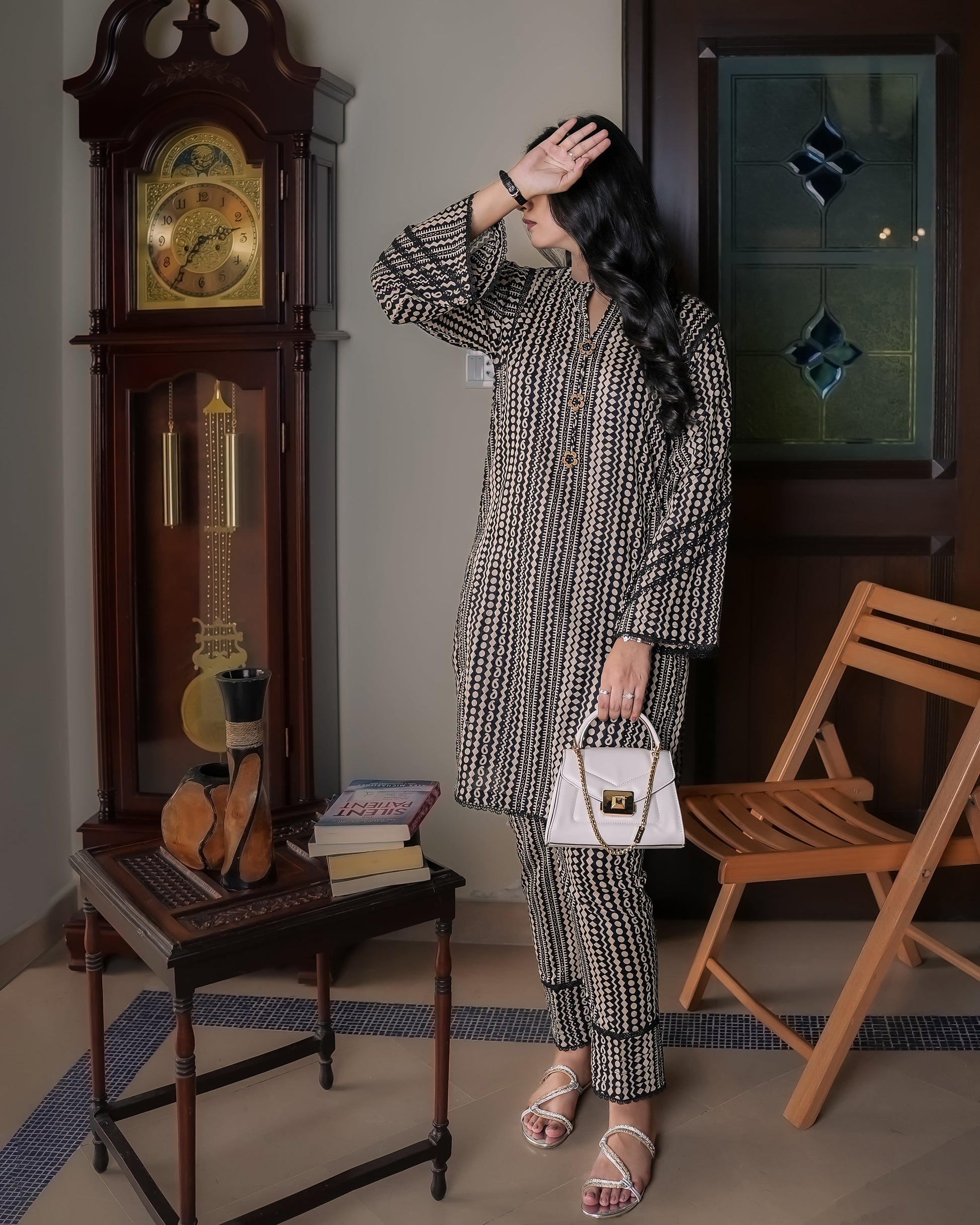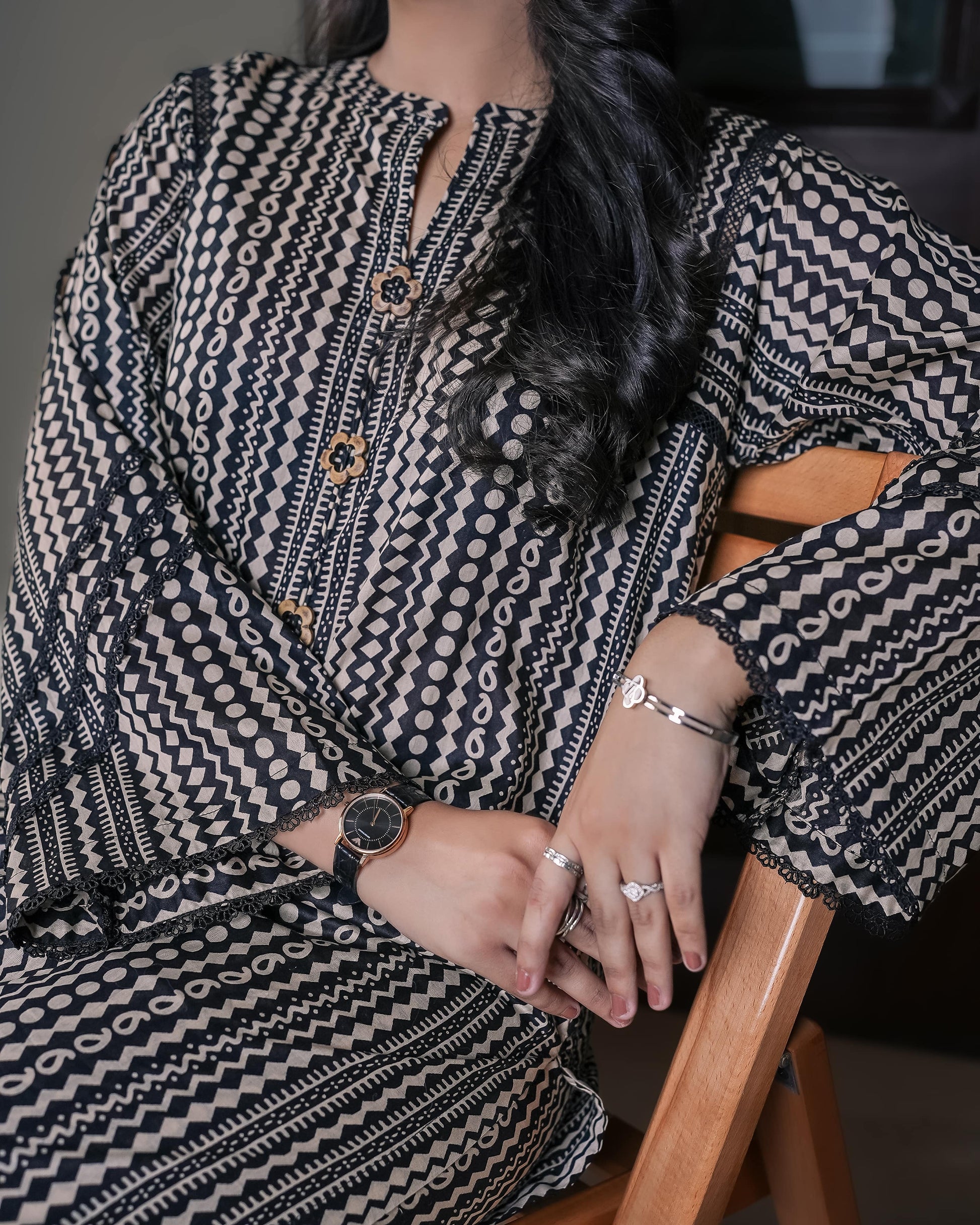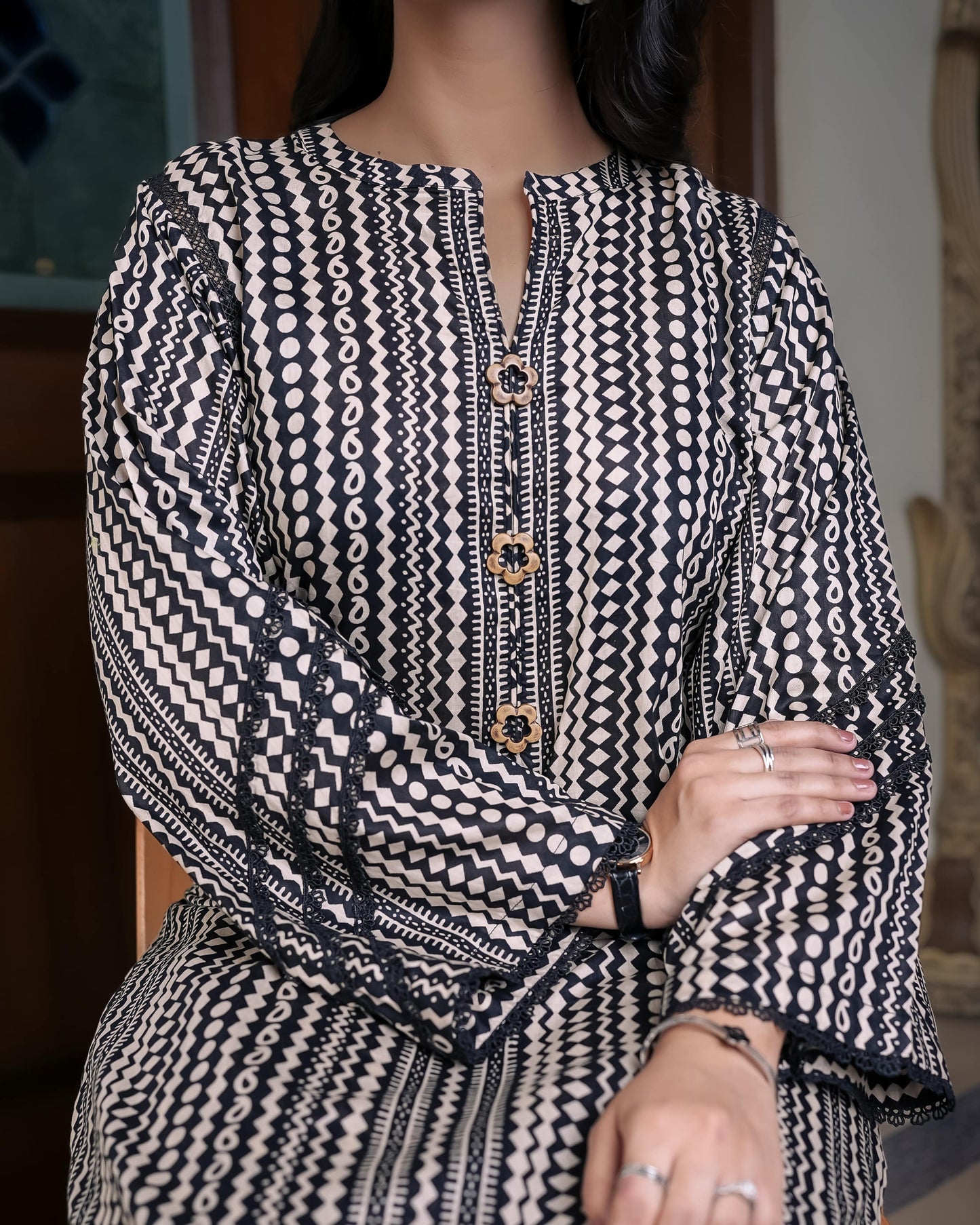 The two piece lawn pret is absolutely unique and stylish. With wooden buttons on the neckline and lace detailing on the sleeves, it adds a touch of personality and charm to the overall look. The wooden buttons give a rustic and earthy feel, while the lace detailing on the sleeves adds a touch of elegance and femininity. It's a beautiful combination of different elements that make this suit truly one-of-a-kind.