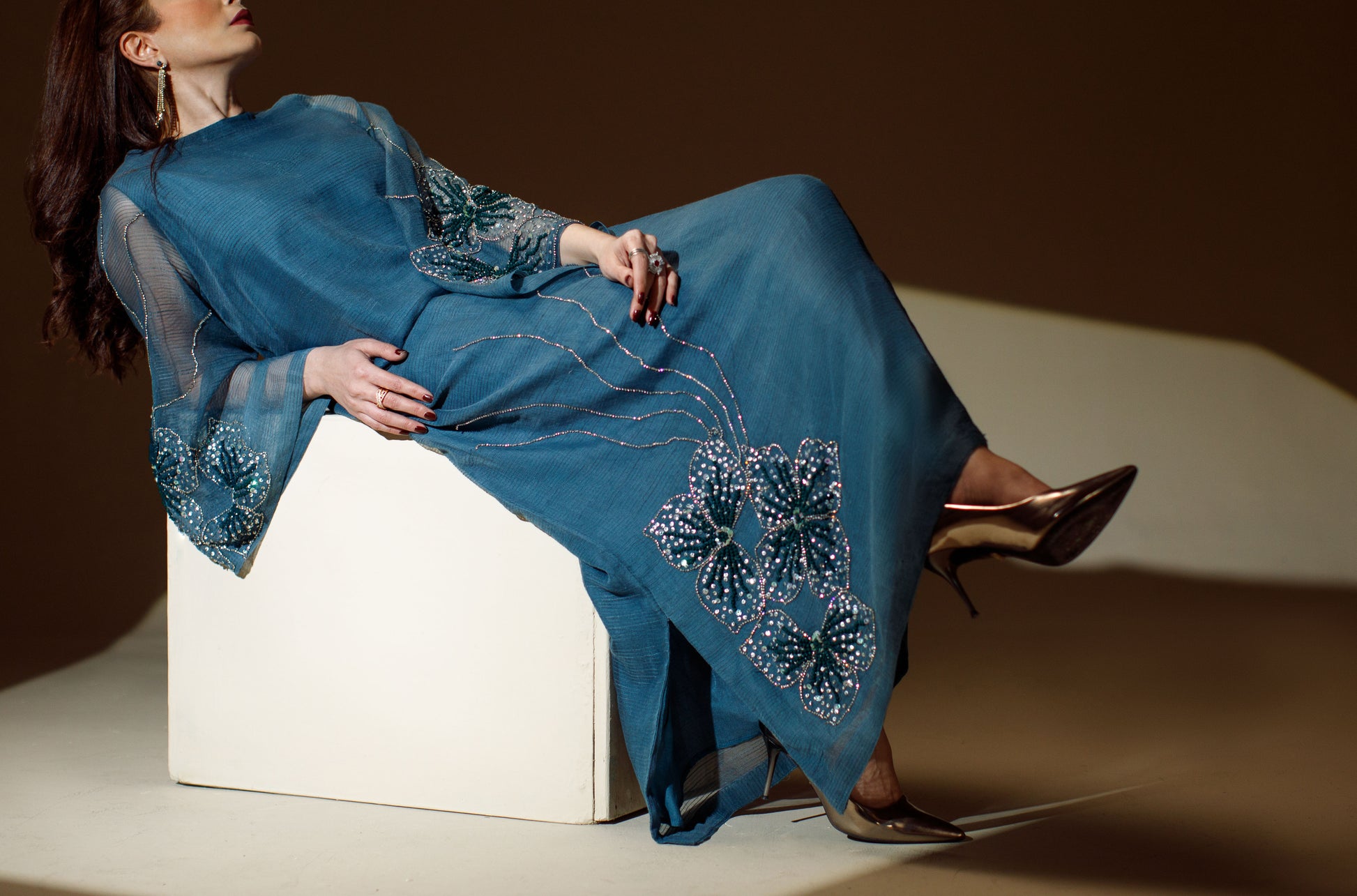 Elegant teal long shirt with shimmering sequins and pearl handwork on the sleeves and border, paired with straight trousers for a chic, refined look