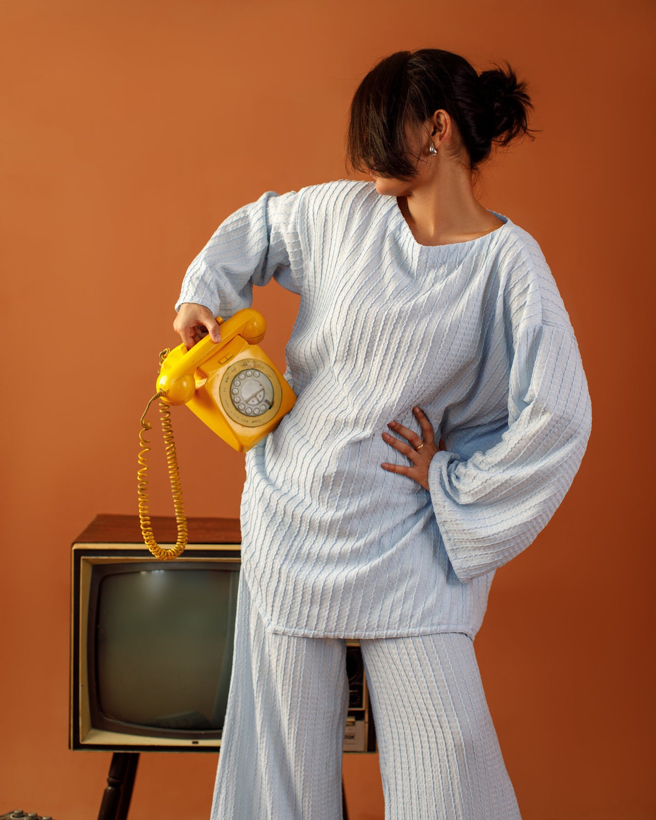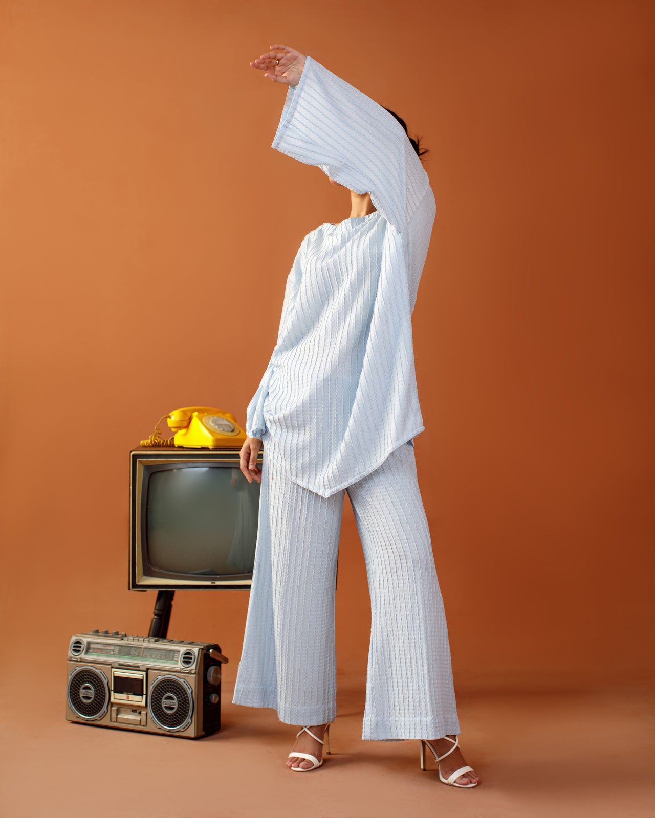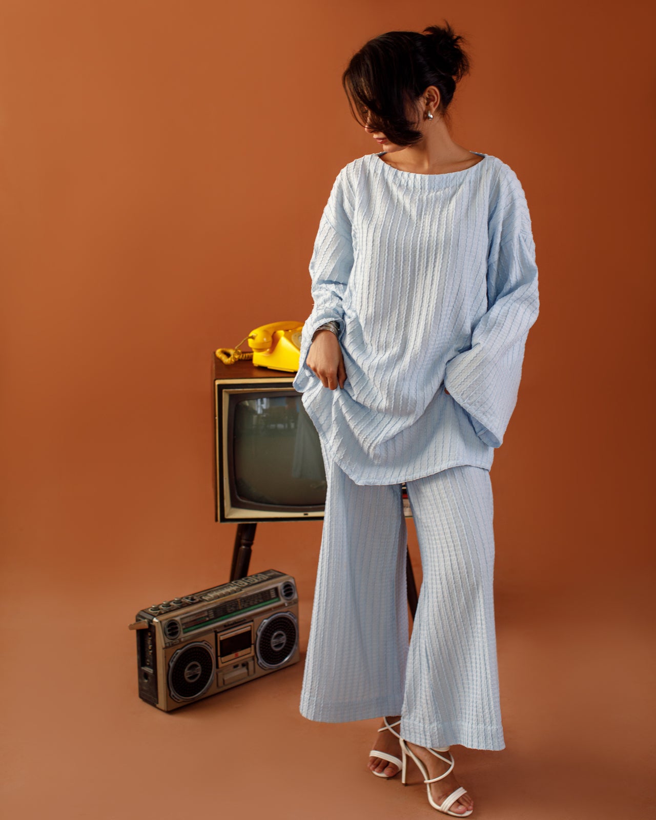 This sky hour co-ord set from Ombrella is your go-to for modern comfort. Featuring a relaxed-fit bell-sleeve top and wide-leg pants, the soft textured fabric drapes beautifully while keeping things casual yet refined.
