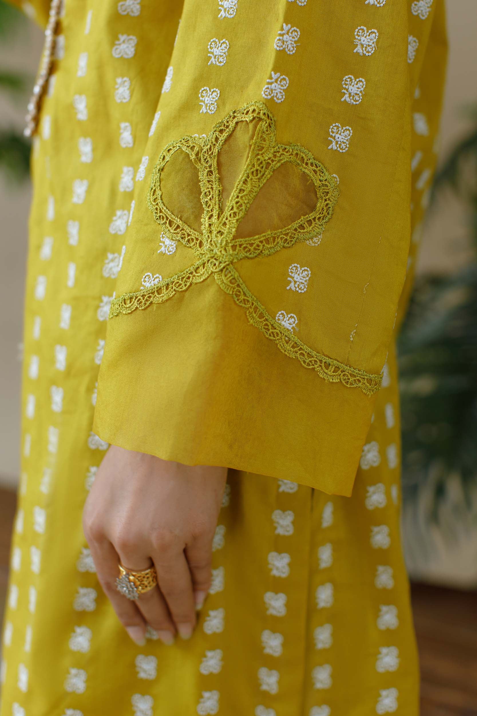 This elegant three-piece embroidered suit set features intricate organza and lace detailing for a refined, luxurious look. Paired with embroidered culottes and a soft chiffon tie-and-dye dupatta, it’s the perfect choice for festive wear, weddings, or formal gatherings. A timeless blend of tradition and modern style.