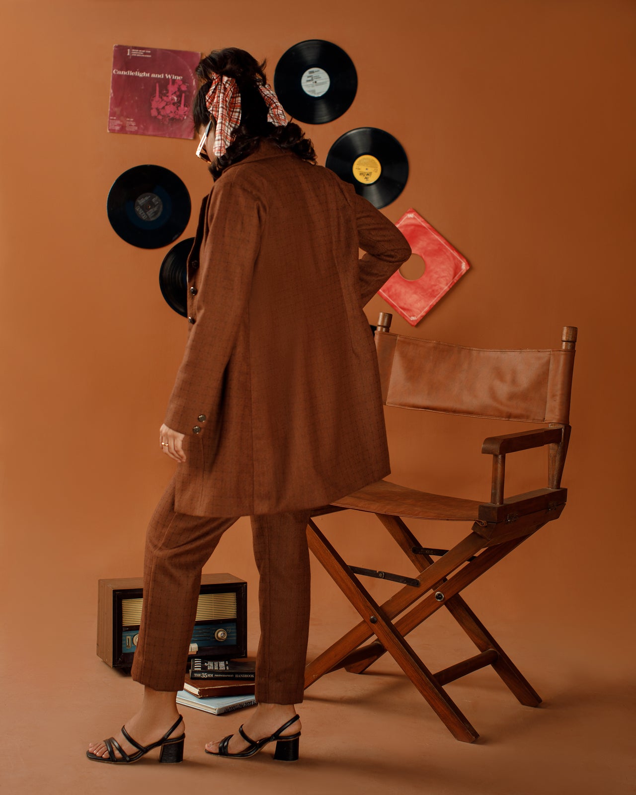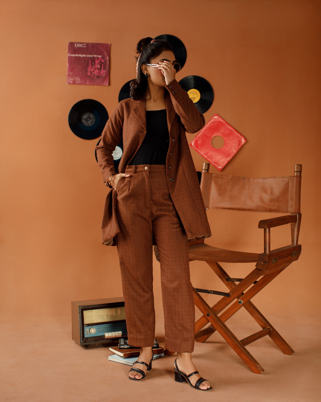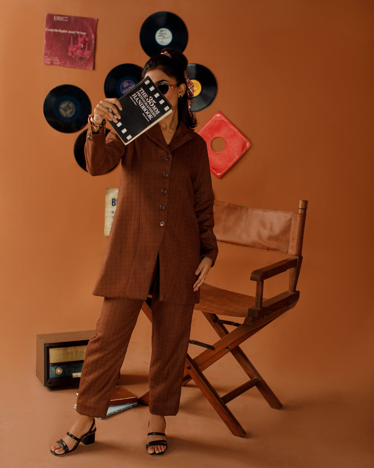 Step into effortless style with this elegant checkered co-ord set, featuring a longline coat with sleek metal buttons and tailored straight-leg pants. Perfect for office wear, formal outings, or smart casual looks.