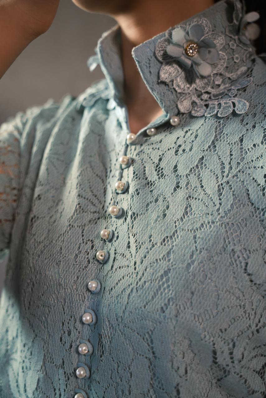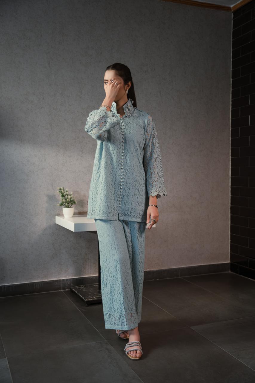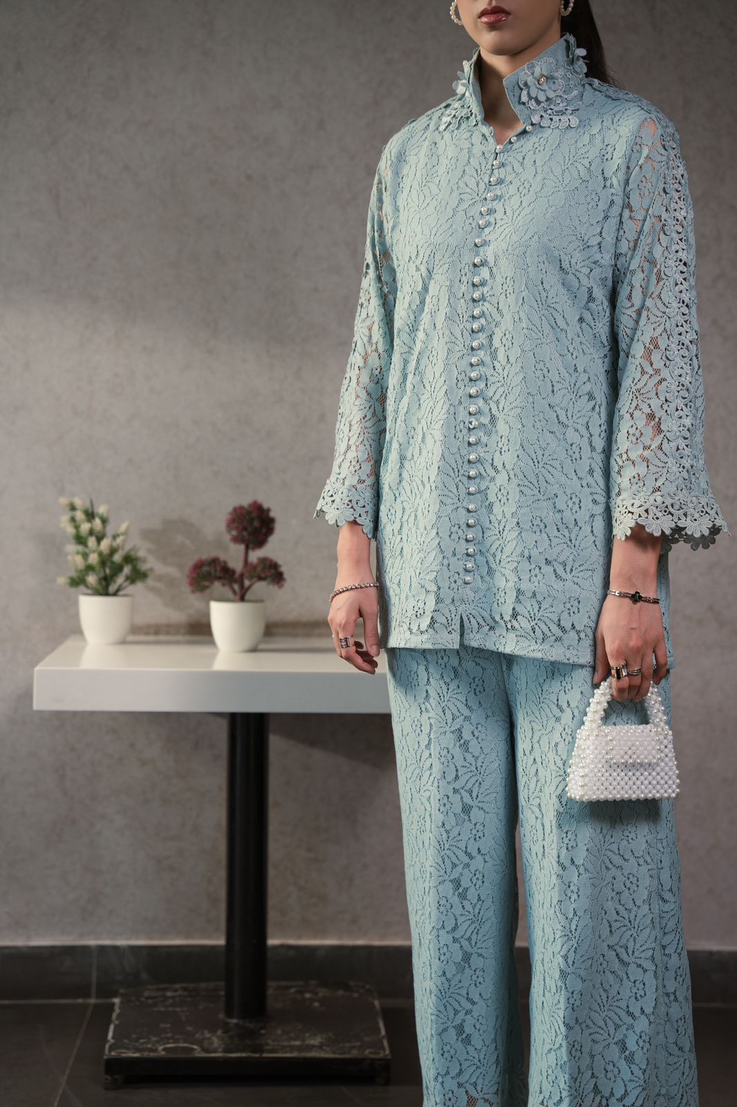 The dress is a light blue lace ensemble, consisting of a button-down tunic with long sleeves and wide-legged pants. The lace fabric features an intricate floral pattern, adding a delicate and feminine touch. The tunic has a high-neck collar and applique work on it.