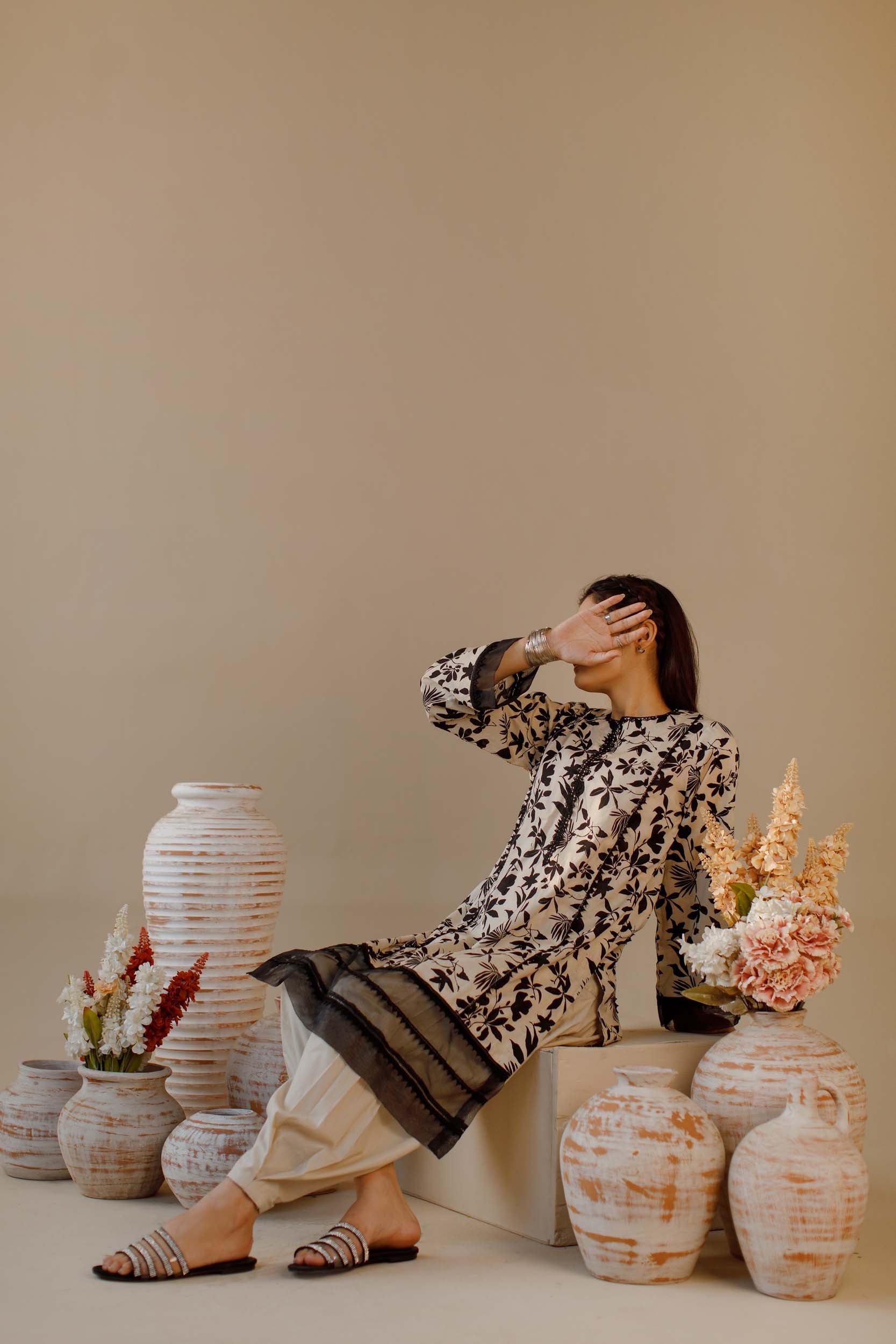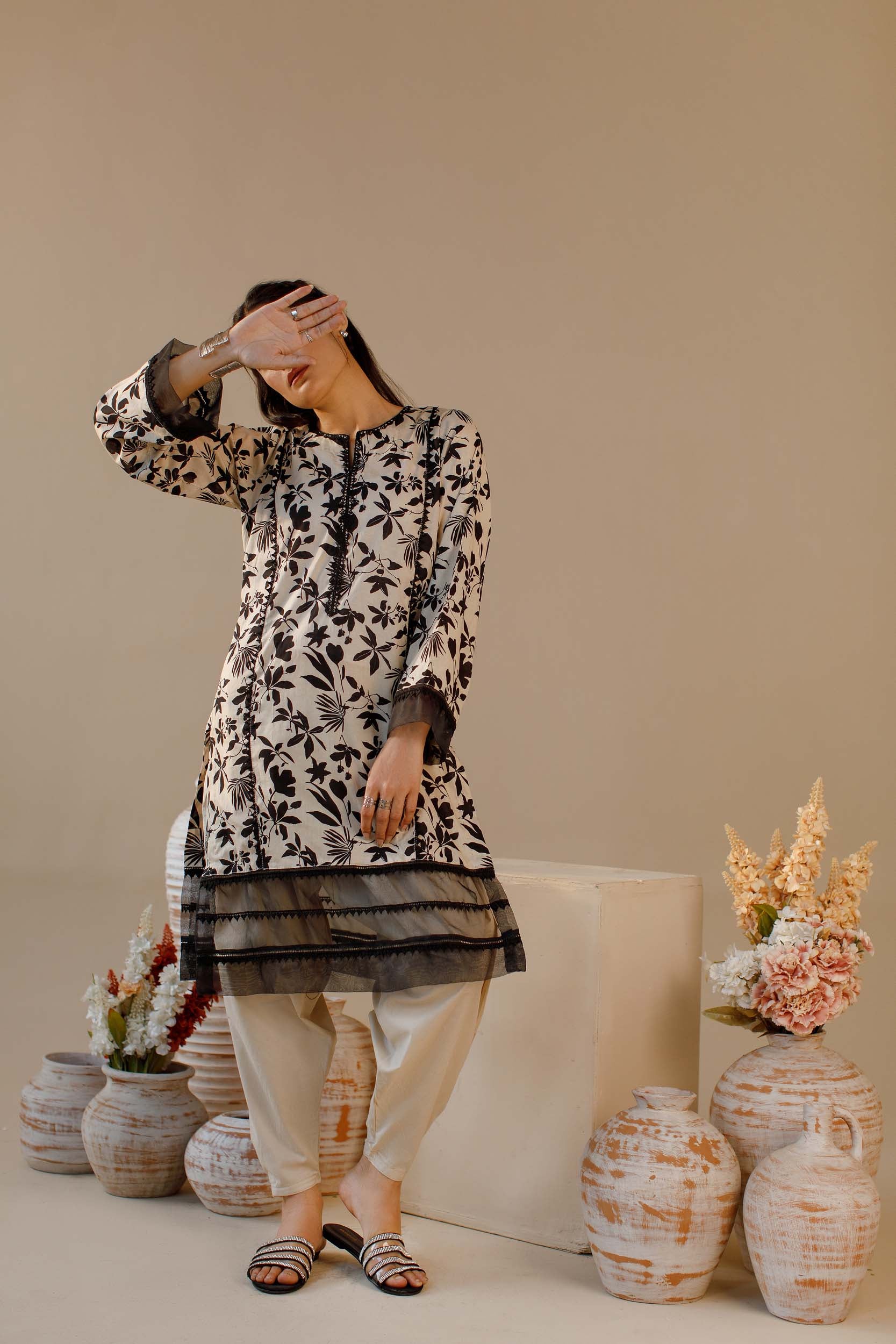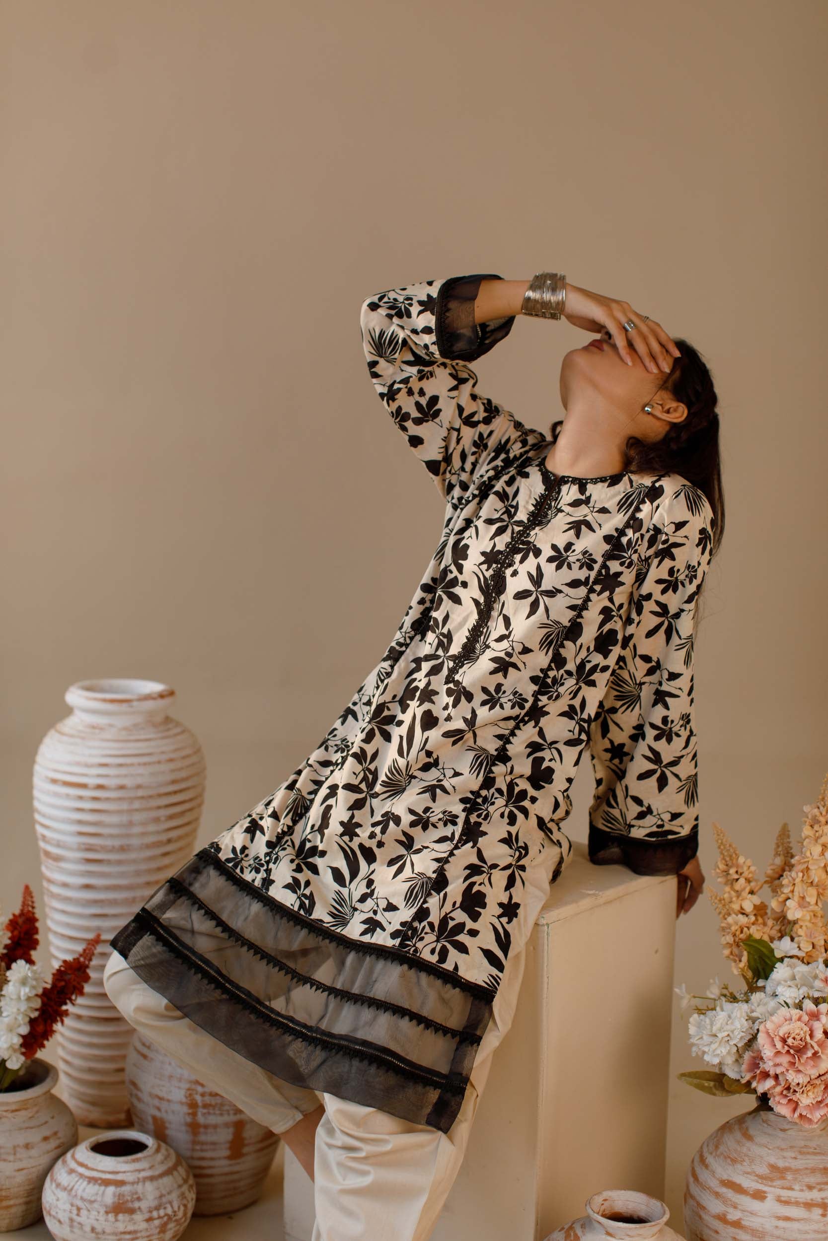 Black and beige floral co-ord set with delicate black lace finishing, paired with a stylish tang shalwar. A perfect blend of comfort and elegance