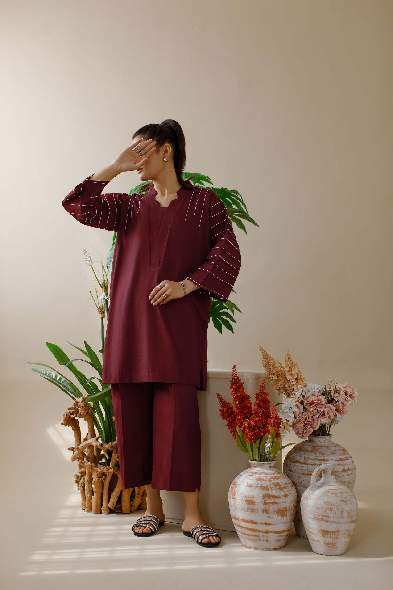 A sleek maroon two-piece co-ord set featuring a solid shirt paired with matching culottes. Minimal yet stylish—perfect for everyday elegance or casual outings