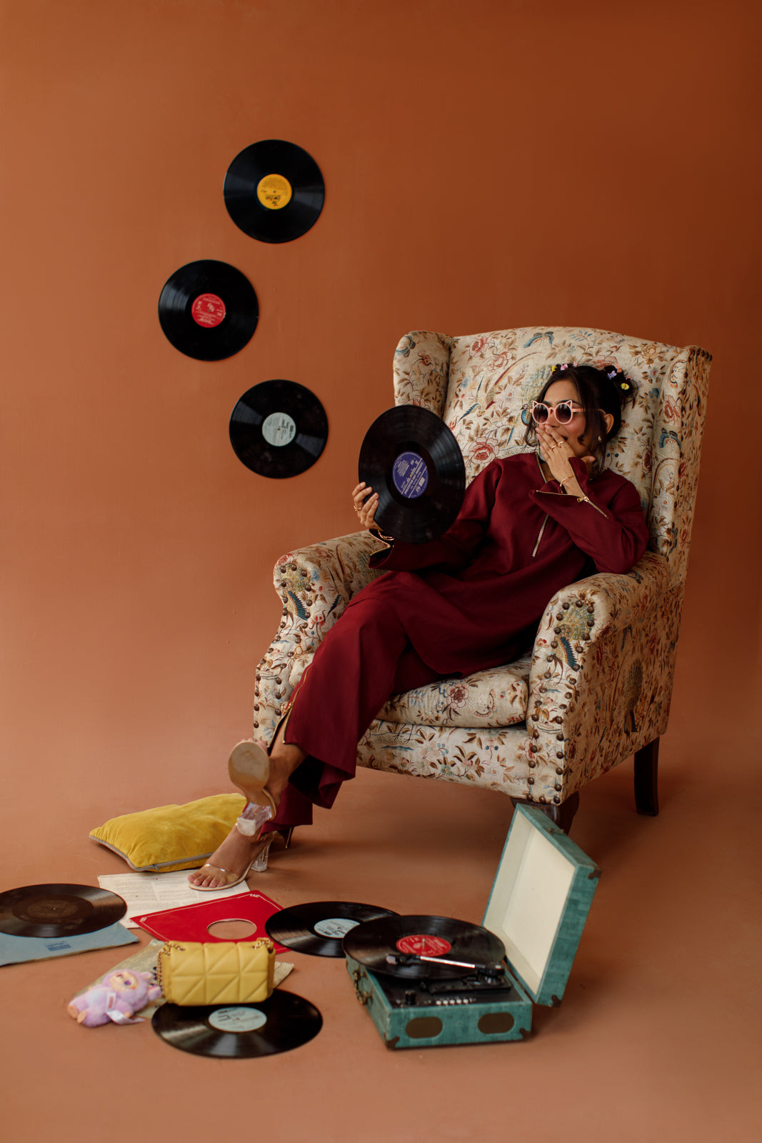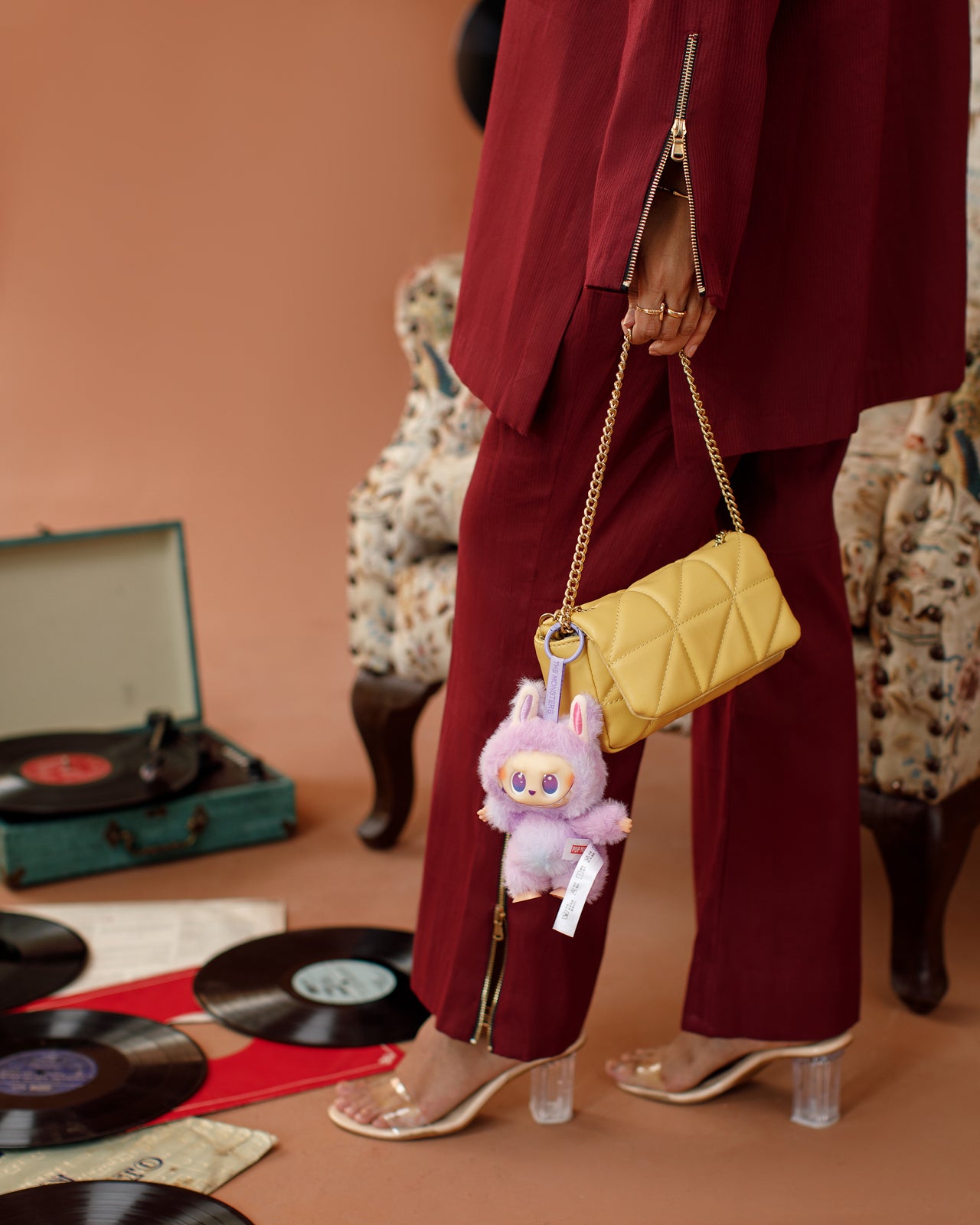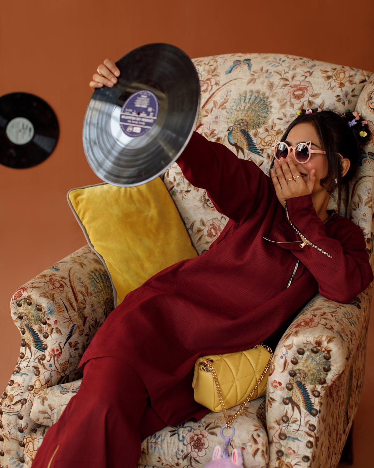 Maroon coord set featuring golden zips on the sleeves and neck for a luxe touch. Paired with bootleg trousers detailed with side zips for a sleek, modern finish