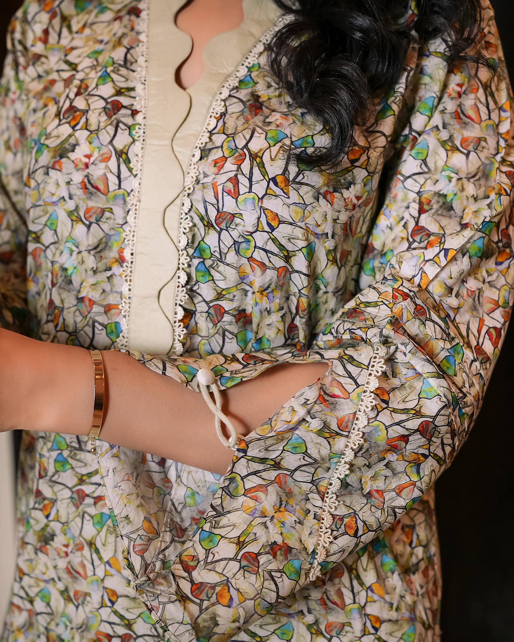 Mosaic is designed with a neckline that has a wavy, scalloped edge. And on the sides of the shirt, there's lace finishing, adding a touch of charm and elegance. The combination of the scalloped neckline and lace sides creates a lovely and feminine look. And to complete the outfit, it's paired with straight pants, giving it a sleek and polished appearance.