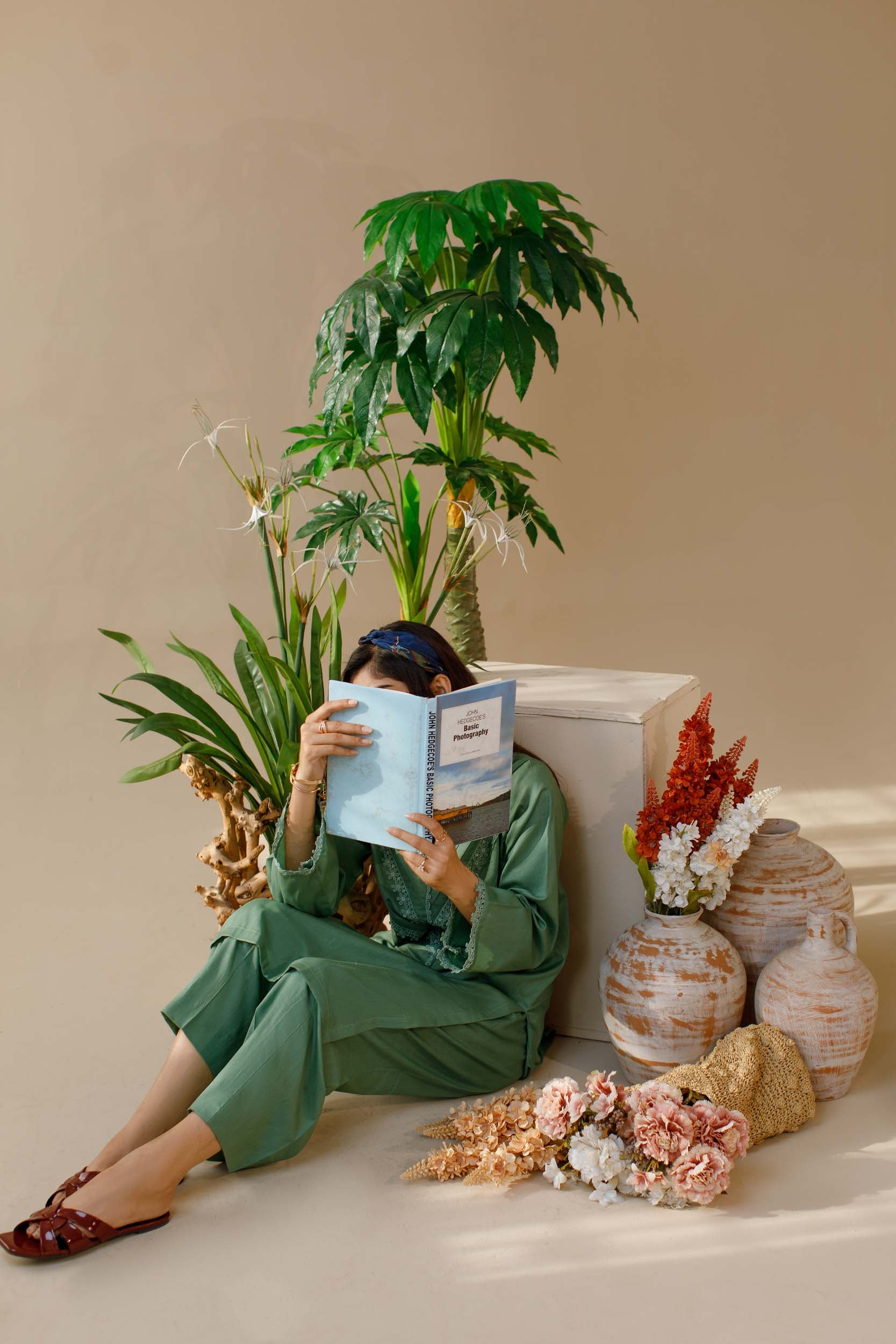 This elegant green co-ord set features intricate lace and pleat detailing along the neckline, adding a touch of refinement. Paired with classic straight pants, it offers a stylish yet comfortable look perfect for both casual and semi-formal occasions
