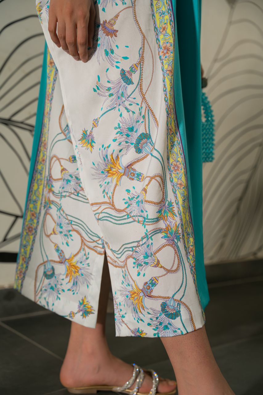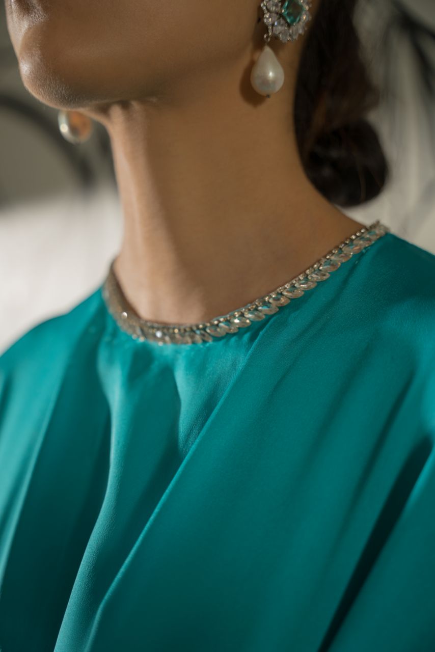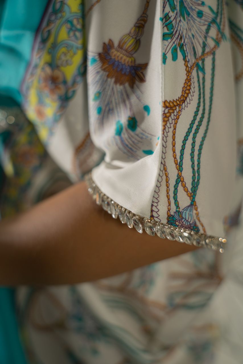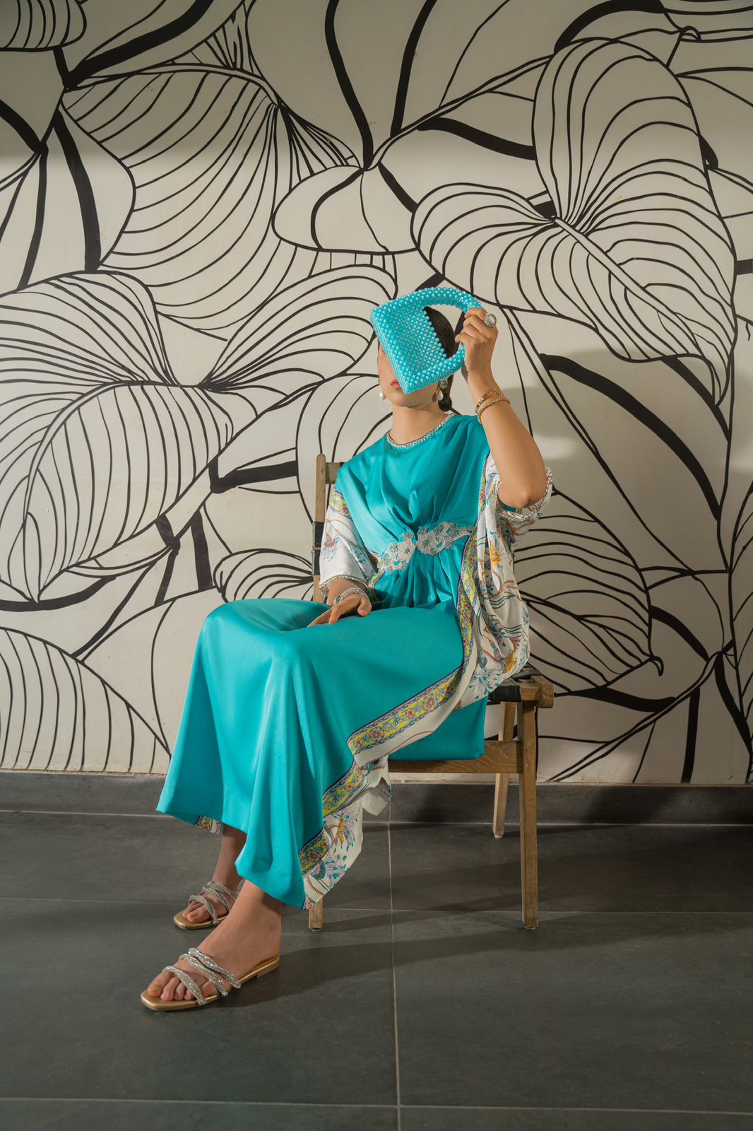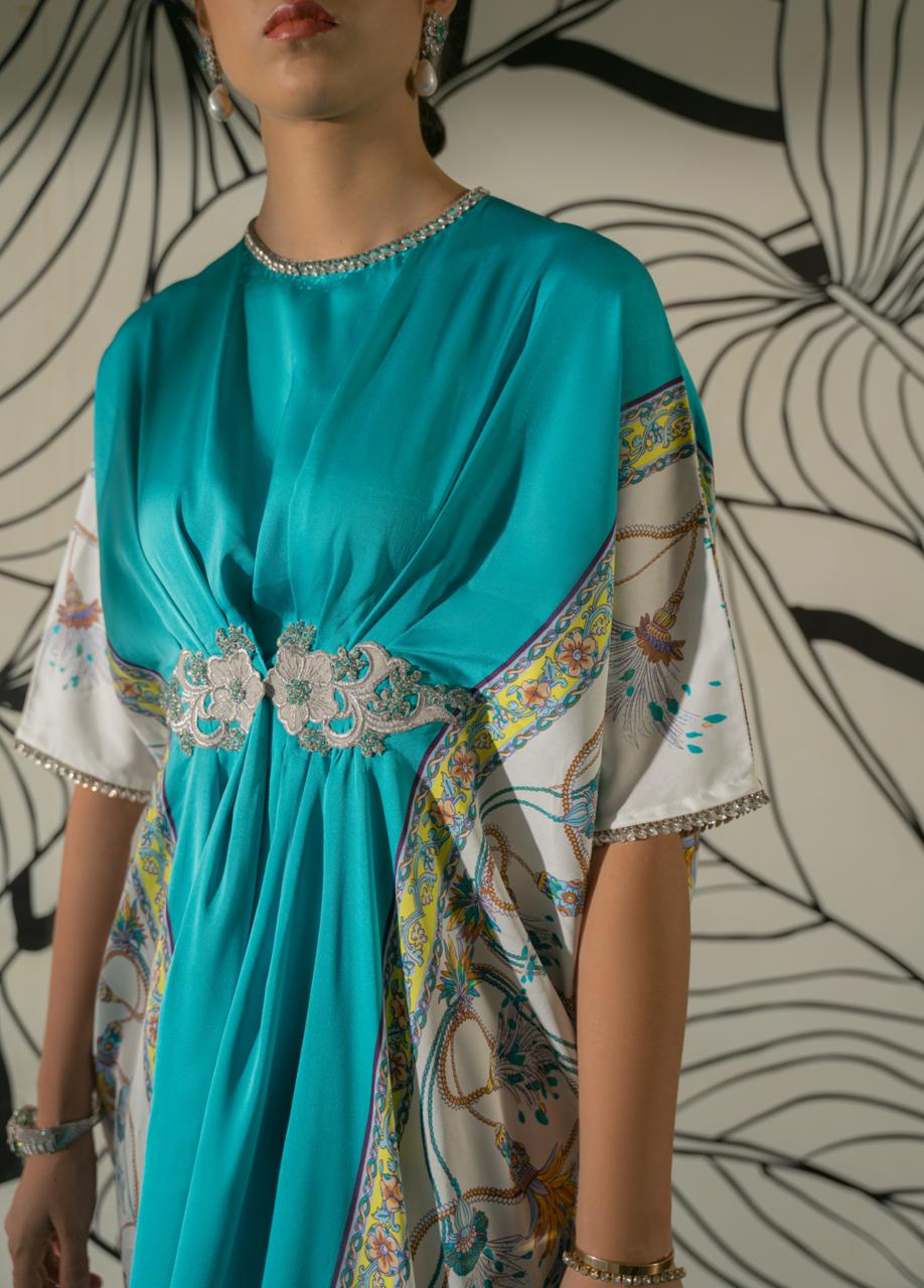 The dress is a flowing teal gown with a cinched waist accentuated by a hand embellished belt. It features patterned white sleeves with multicolored designs and a complementing border along the hem.
