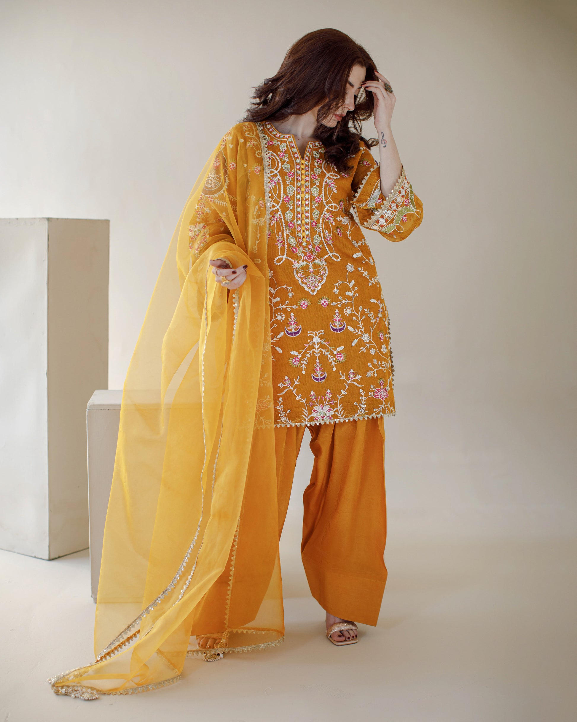 This Khaadi Net Embroidered Suit features intricate embroidery with sequin accents, paired with a flowing Farshi Shalwar and a delicate Organza Dupatta, finished with lace and tassels. A perfect blend of tradition and elegance for any special occasion