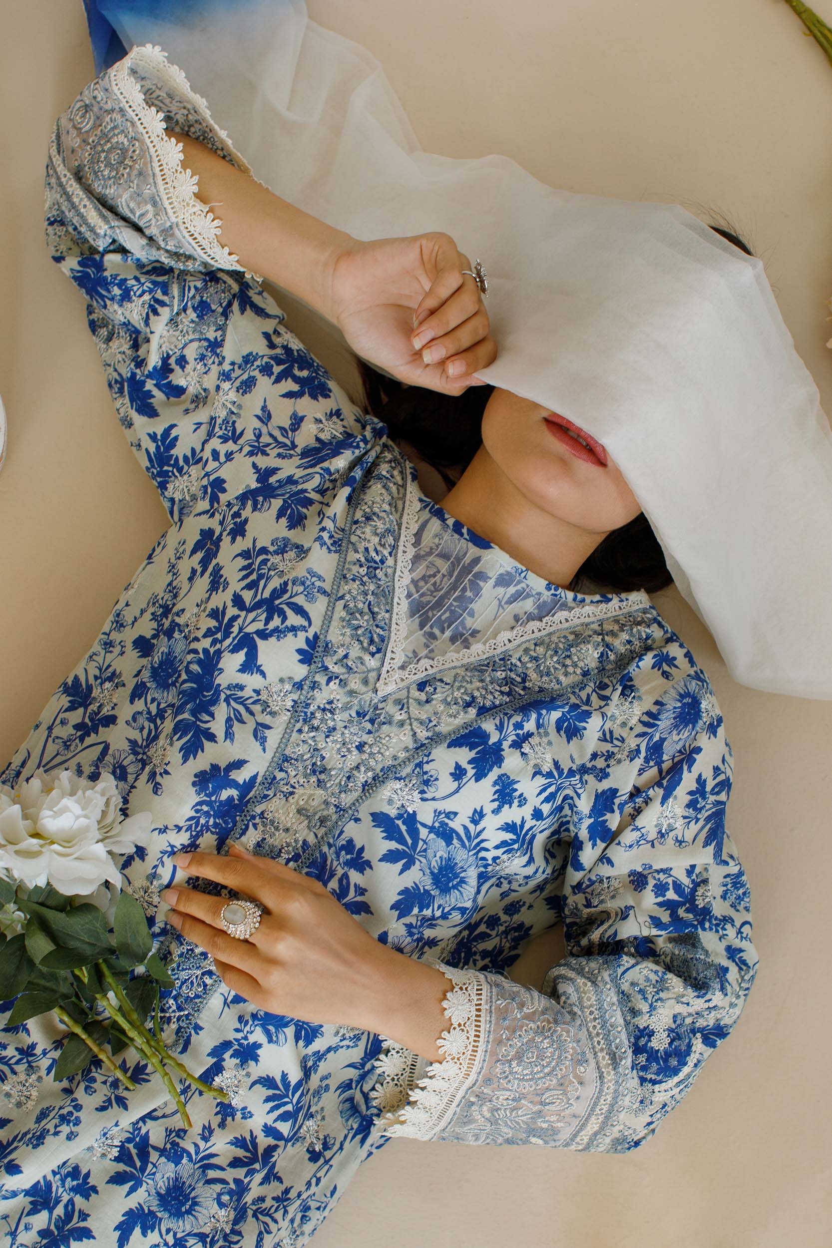 Chic and sophisticated, this blue and white floral ensemble features heavy white and blue embroidery on the daman and sleeves. The pleated organza neckline and embroidered organza sleeve patches add a refined touch. Paired with matching printed pants and a tie-dye organza dupatta, this outfit is perfect for festive or semi-formal occasions.